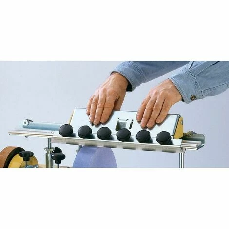 Variable use for varying knife widths. Precise; smoothly running and maintenance-free friction bearing guiding, hard anodized, fine-adjustment for grinding angles, maximum grinding length 400 mm.