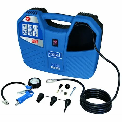 “The Scheppach AIR-FORCE 2 is a lightweight portable compressor kit suitable for a variety of inflation jobs around the house. It features an oil-free pump, powerful 1100 W motor, 180 L/min air intake capacity, and 8 bar operating pressure. Ideal for inflating car tyres, bike tyres, sports balls, boats, rafts, paddling pools, and mattresses. Completely maintainance free, the AIR-FORCE compressor is a complete starter package inc. 3 m air hose, tyre inflator, and 10 x pce nozzle kit. The must have tool for any garage.”Powerful 1100 W motorMulti-App portable compressorOil & maintainance free180 L/min air intake capacity8 bar max. operating pressure3 metre hose lengthStorage chamber for cable & hoseComes with tyre inflating gun & nozzlesIdeal for all household inflation jobs5 metre cable lengthSupplied with AIR-FORCE compressor : 1 x inflating gun, 3 meter high quality air hose, 10 x piece inlating nozzles & needles, instructionsSpecificationDimensions L x W x H : 560 x 150 x 360 mmOperating pressure max: 8 barIntake capacity: 180 L/minCable length: 5 mHose length: 3mSpeed max.: 3750 rpmMotor: 230 V – 50 HzInput: 1100 WWeight: 5 kg